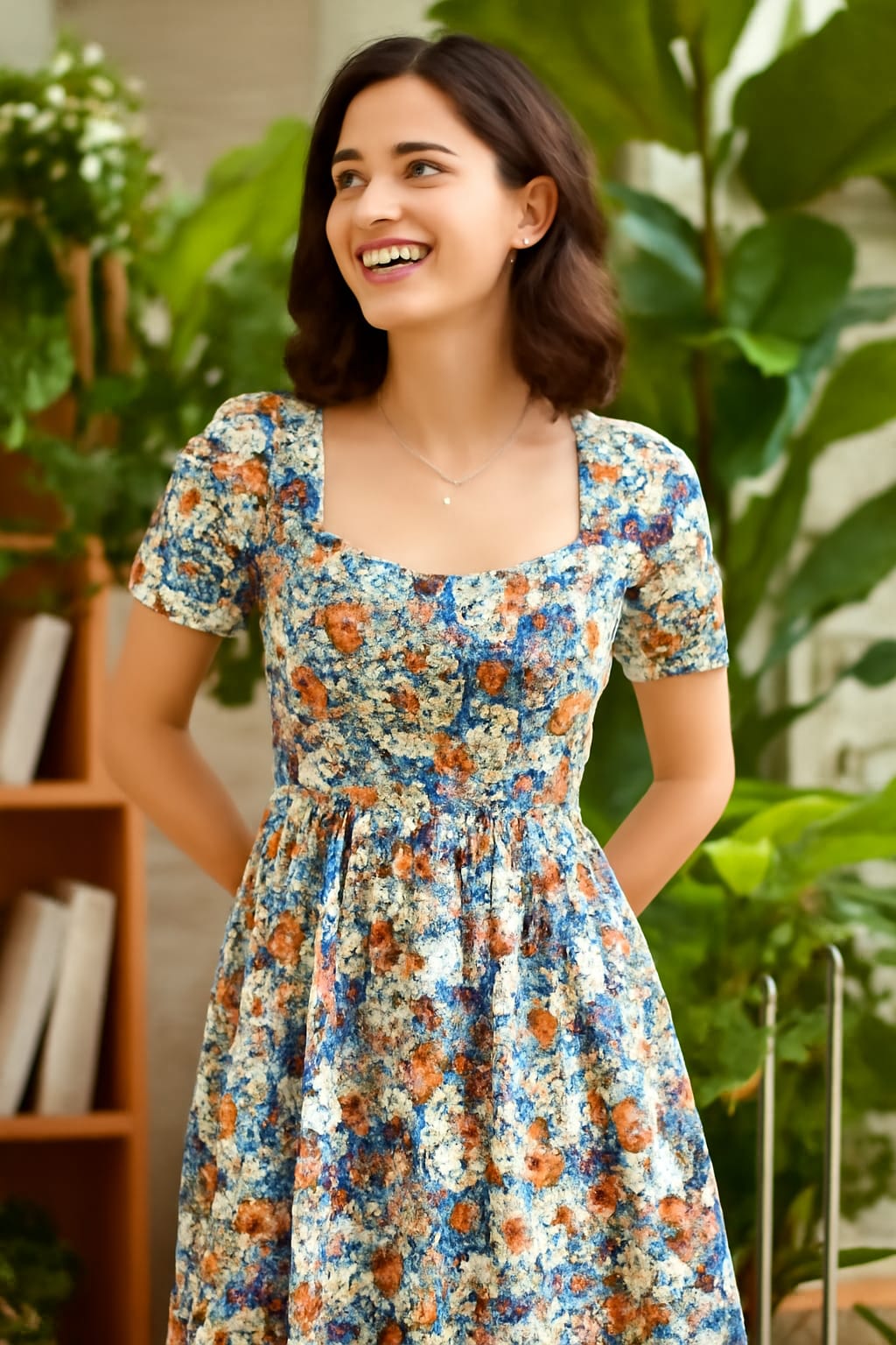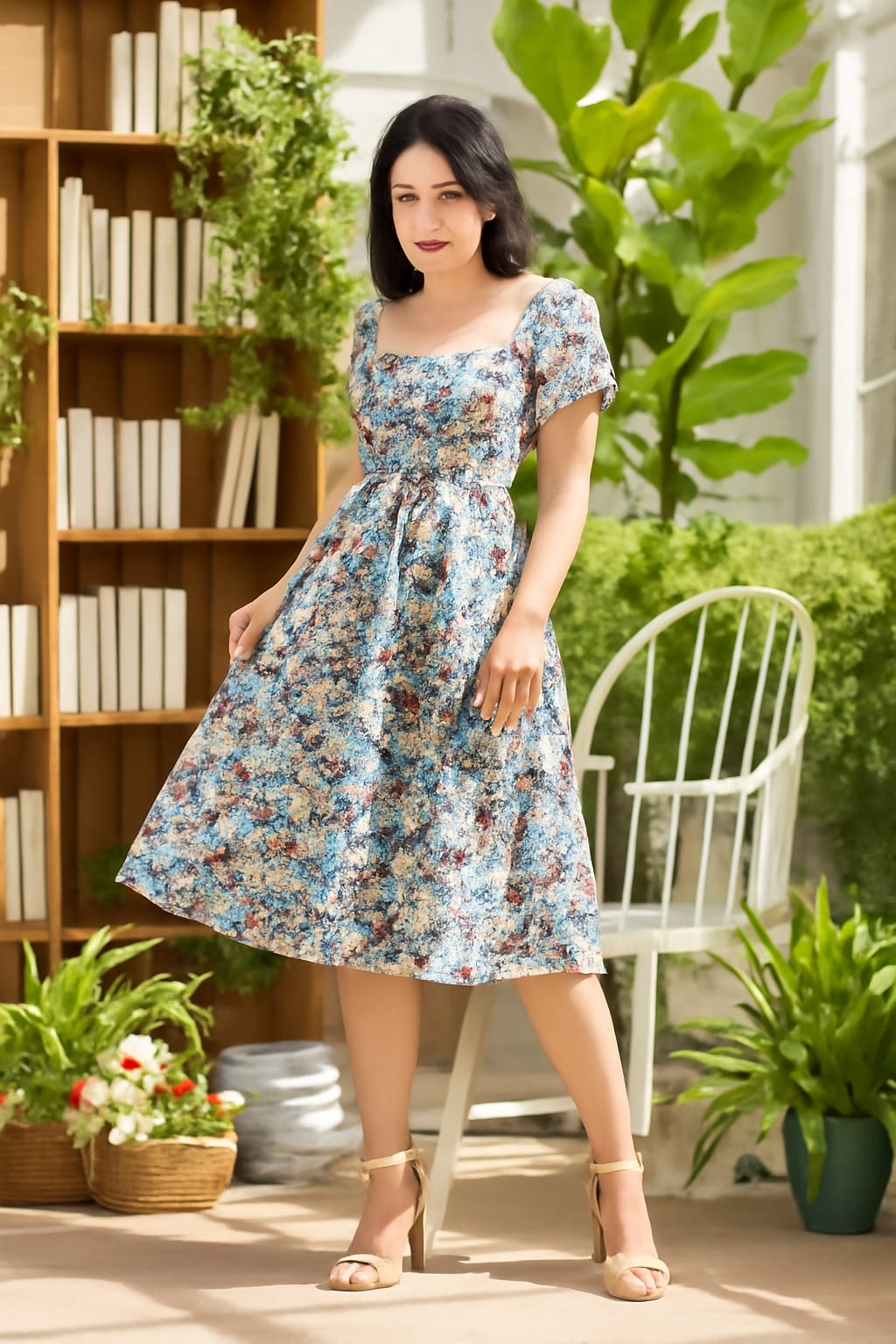 Premium quality cotton for a soft and lightweight feel. Design: Multi base with vibrant floral prints for a feminine touch. Neckline: V-neck for a flattering appeal. Sleeves: Short puff sleeves for a trendy vibe. Length: Knee length (37 inches) with a flared hemline.
